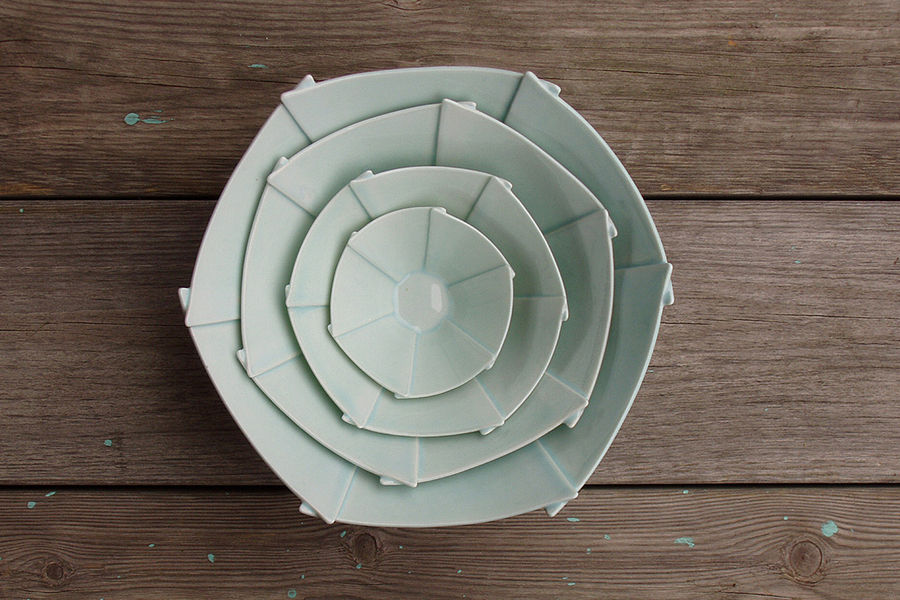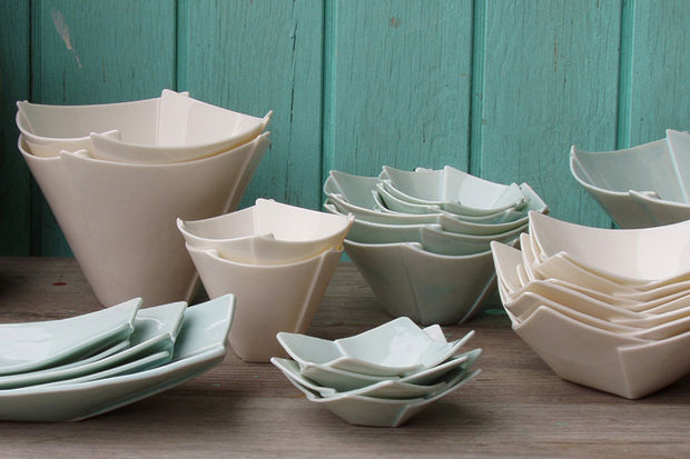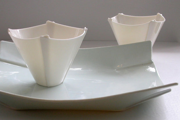 Doch auch die Porzellanmasse wird fein ausgerollt wie ein Kuchenteig, zurecht geschnitten und dann wie ein Papierbogen gefaltet. Das erfordert bei diesem eigenwilligen Material einiges an Fingerspitzengefühl. Dort wo die einzelnen Porzellanflächen zusammengefügt sind bilden sich Konturen als ein feines Muster. Jedes Stück wird einzeln von Hand gearbeitet, womit sich innerhalb der Serie minimale Abweichungen der einzelnen Stücke ergeben. Pia Baastrup braucht ungefähr drei bis vier Mal so viel Zeit um ein Objekt herzustellen, als wenn sie das Porzellan giessen oder drehen würde.